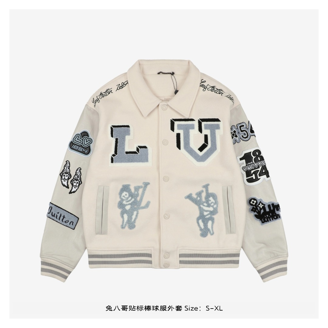 LV 22Fw 兔八哥贴标棒球服外套,采用羊毛丝绸混纺面料与进口粒面小牛皮,通过12处贴标与4种刺绣工艺,打造兼具奢华质感与街头趣味的限量单品。