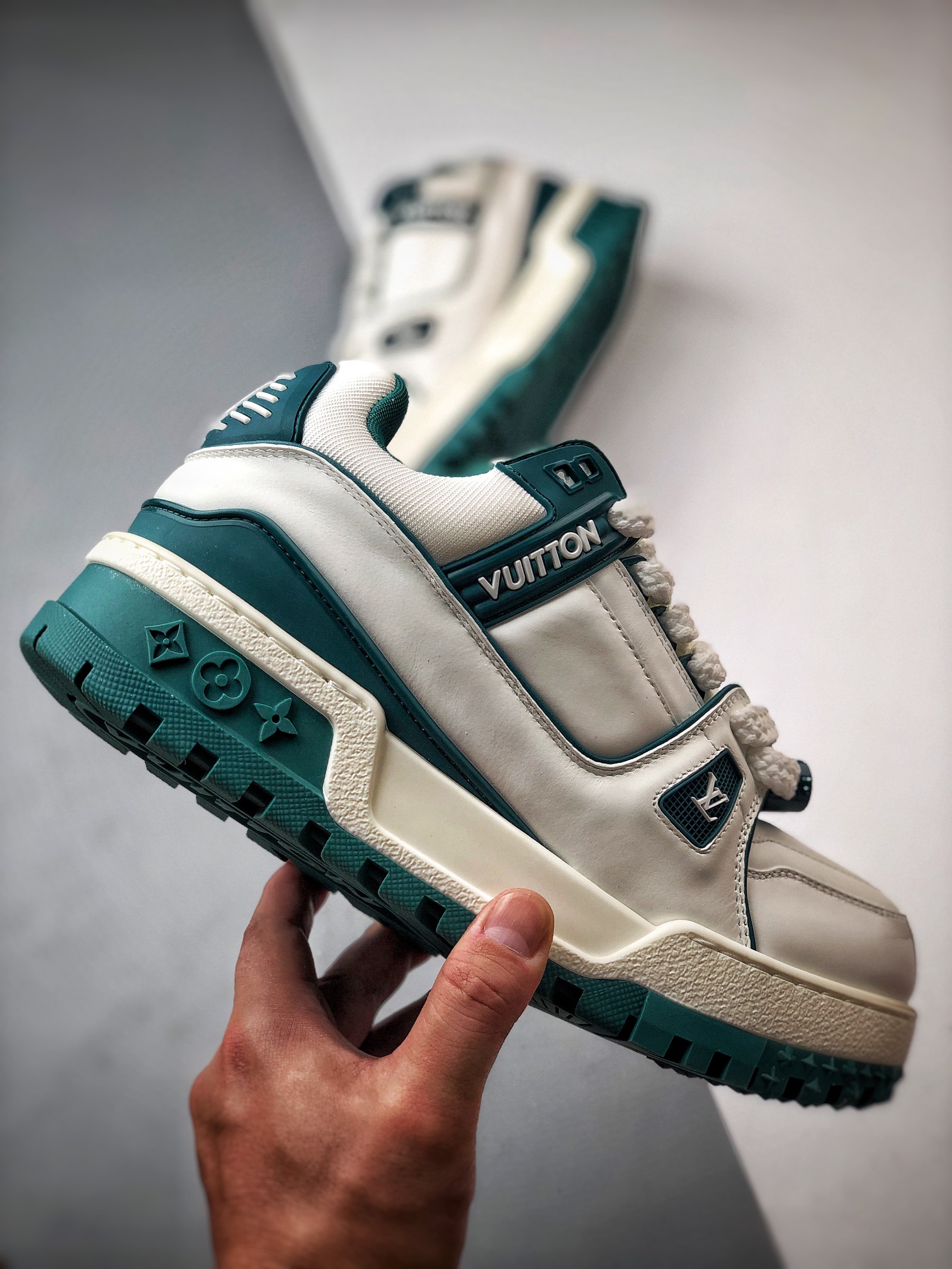 Louis Vuitton Trainer Maxi 白青运动鞋,通过原版开模与私模大底工艺,结合独家嵌入胶内垫设计,打造兼具舒适脚感与品牌辨识度的顶配潮流单品。