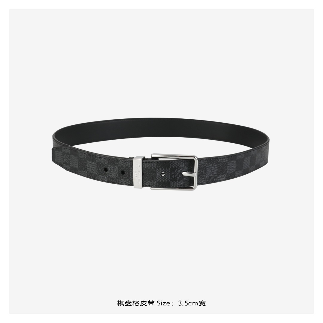 LV 棋盘格皮带,黑灰交错棋盘格纹搭配银色金属扣头,低调耐磨且适配多场合,适合都市男士打造干练形象。
