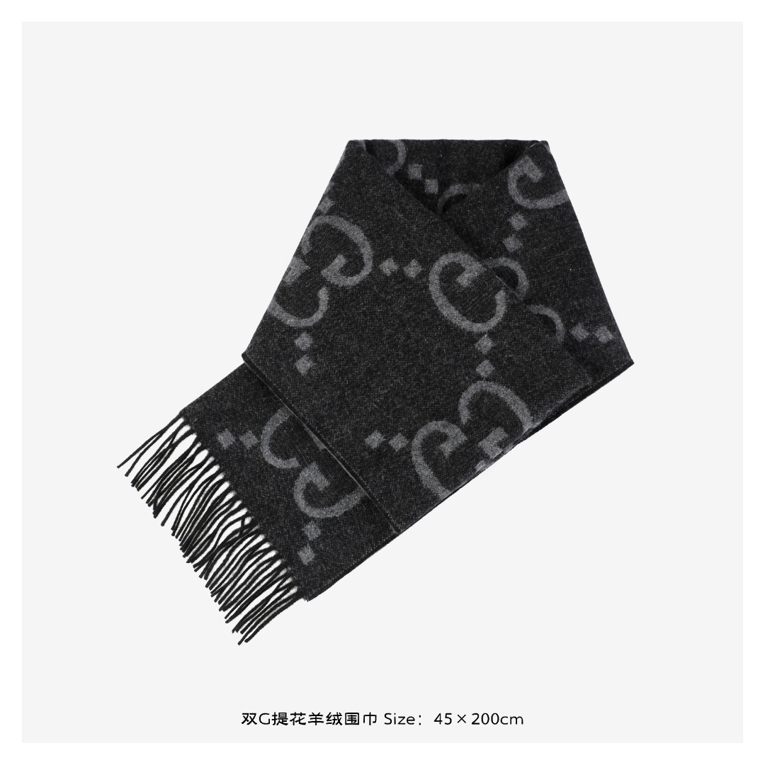 Gucci/古驰 双G提花羊绒围巾,采用100%纯羊绒材质与双面双色设计,超洋气大G提花,适合都市通勤与旅行穿搭,一条围巾实现双重造型。