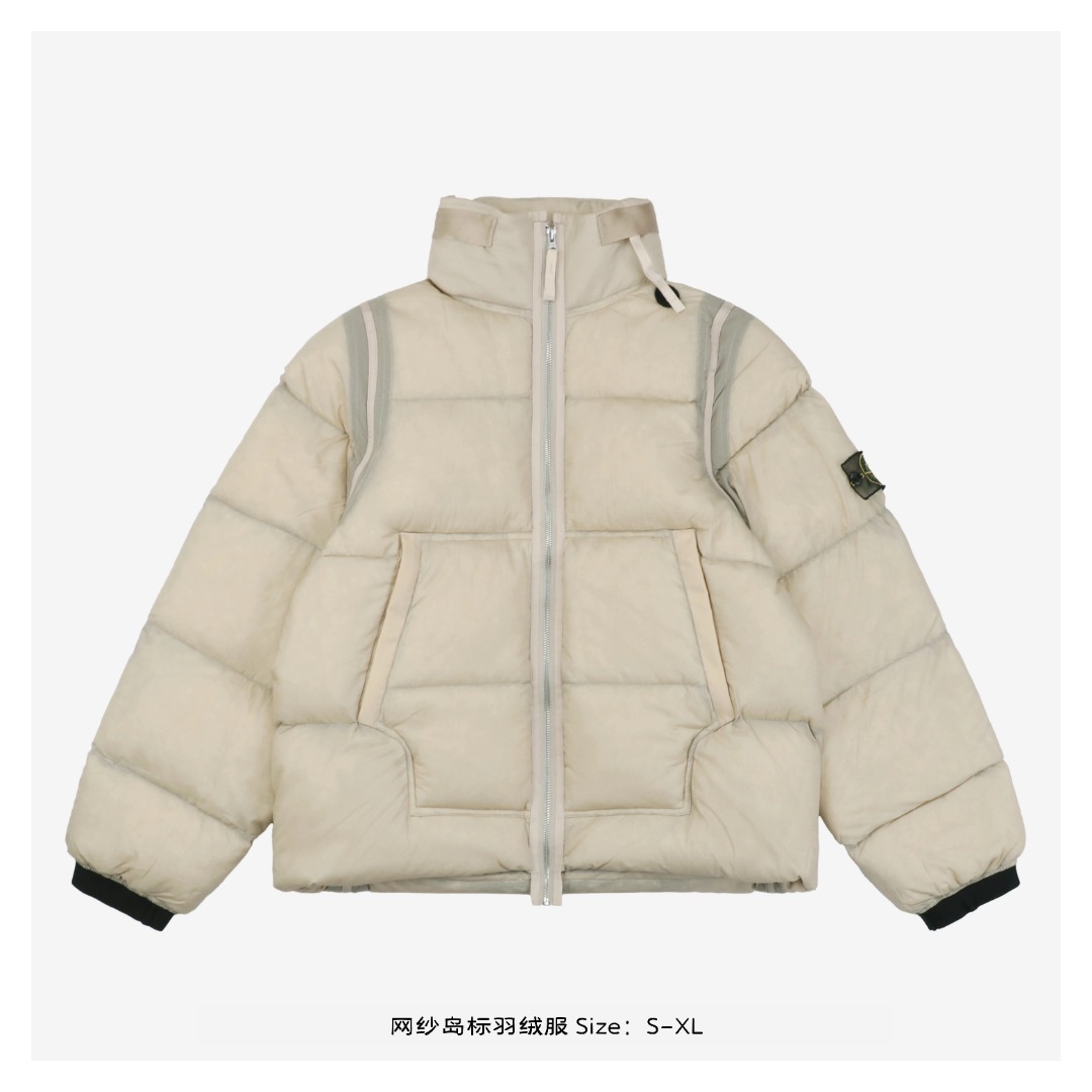 Stone Island 24Fw 网纱岛标羽绒服,采用90国标白鸭绒填充与700蓬松度,400T消光尼丝纺面料结合TPU膜工艺,实现防水防钻绒,渔网肩章刺绣工艺复杂,立领隐藏帽设计实用美观。