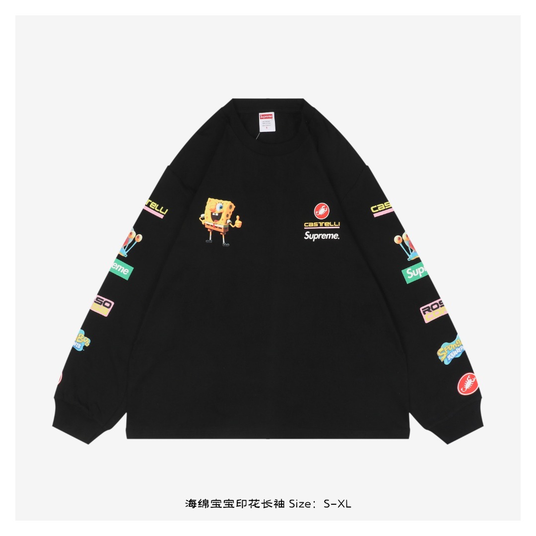 Supreme x 海绵宝宝印花长袖,采用220克纯棉圆筒布与进口康丽数码印花技术,海绵宝宝图案栩栩如生,宽松版型男女同款,适合日常潮流穿搭。