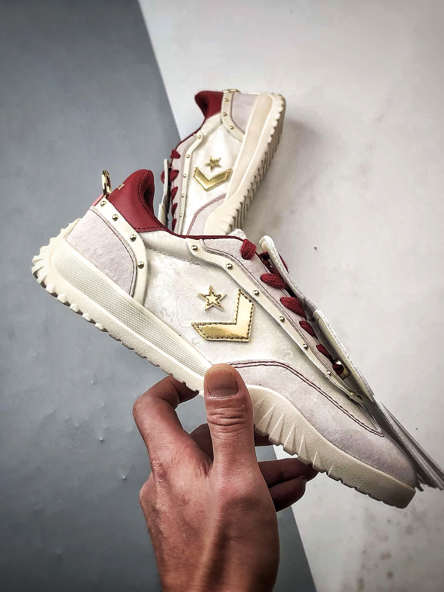 Converse 2026马年限定CNY系列All Star鞋款,以米白麂皮搭配酒红内衬,融入鎏金星箭标、流苏与红白编织鞋带,东方韵味十足。