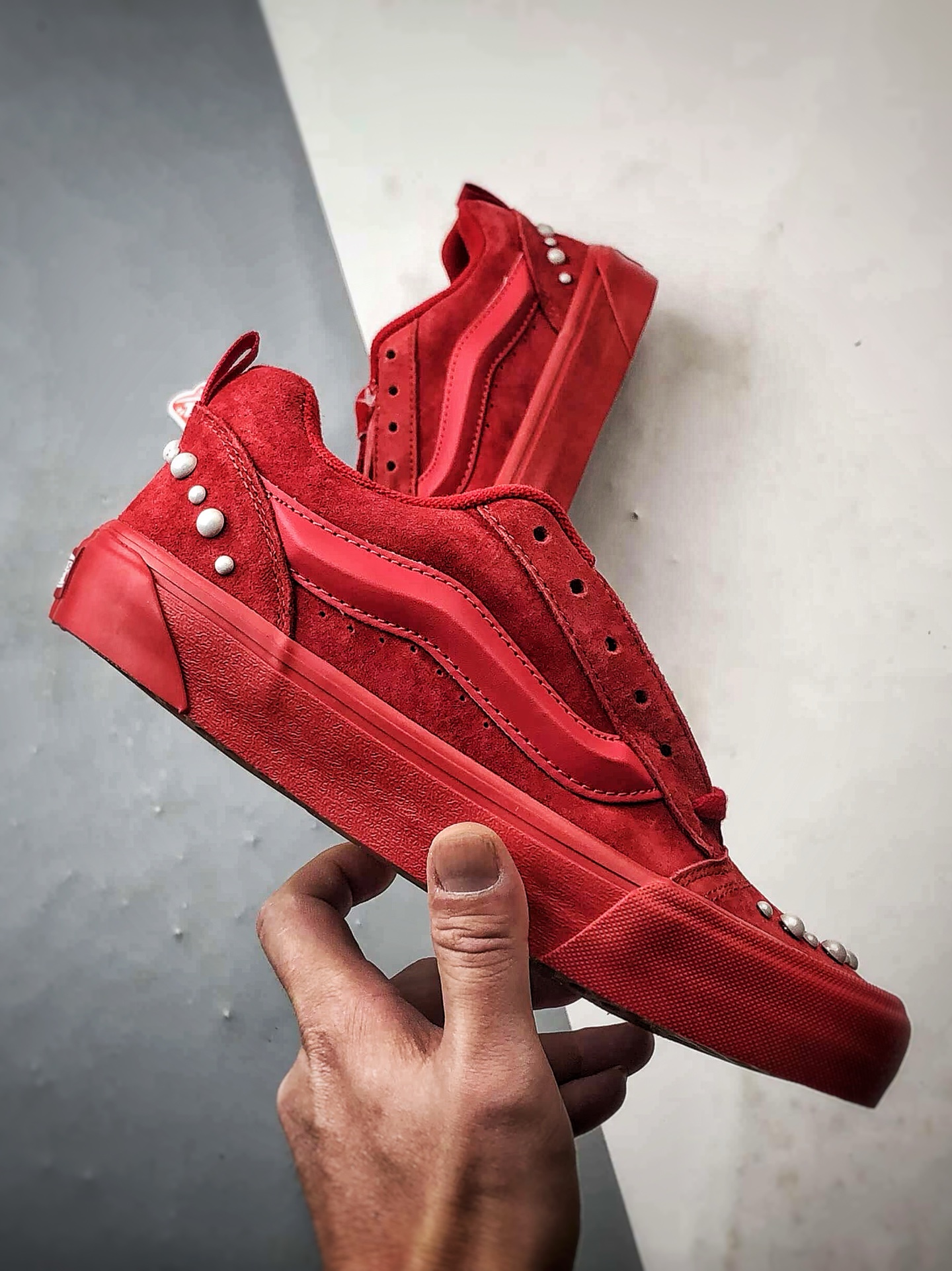 Vans Knu Skool 红色款以经典“面包鞋”廓形为基础,在黑色麂皮鞋面与立体大Logo上点缀珍珠铆钉,大胆玩味复古街头风。