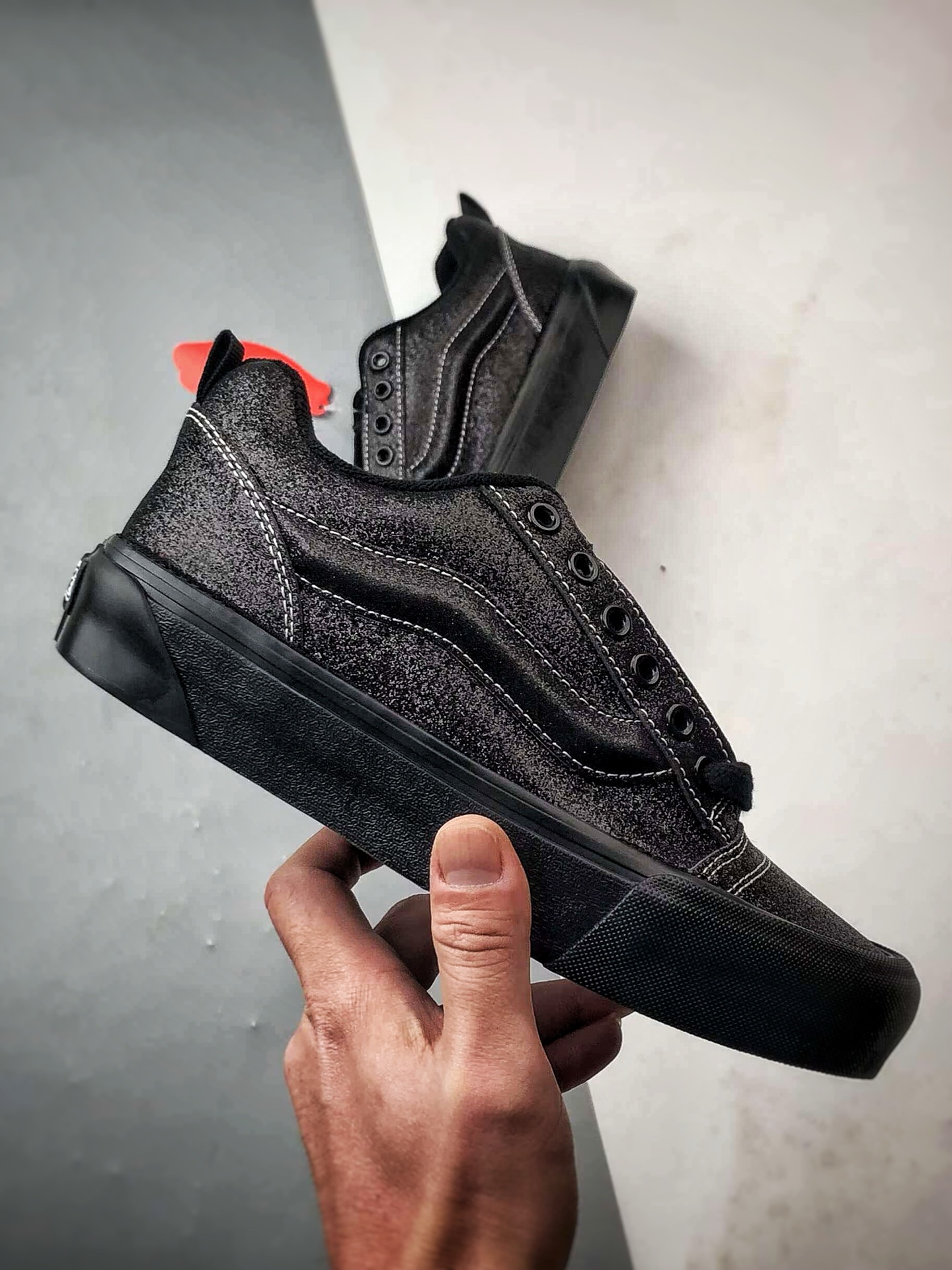 Vans Knu Skool 黑色“黑武士”款,融合黑色麂皮与珠光亮面材质,呈现全黑酷感面包鞋造型。