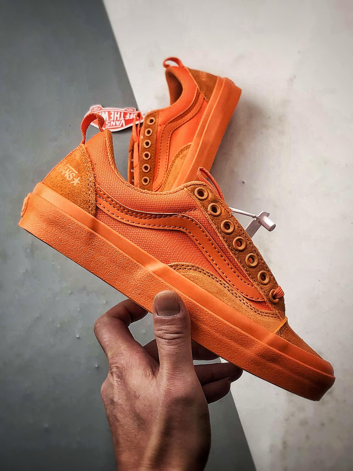 Vans与摄影师Atiba Jefferson联名推出Old Skool 36 橙色滑板鞋,麂皮拼接网眼布,鞋垫融入街头摄影元素,兼具经典轮廓与潮流细节。