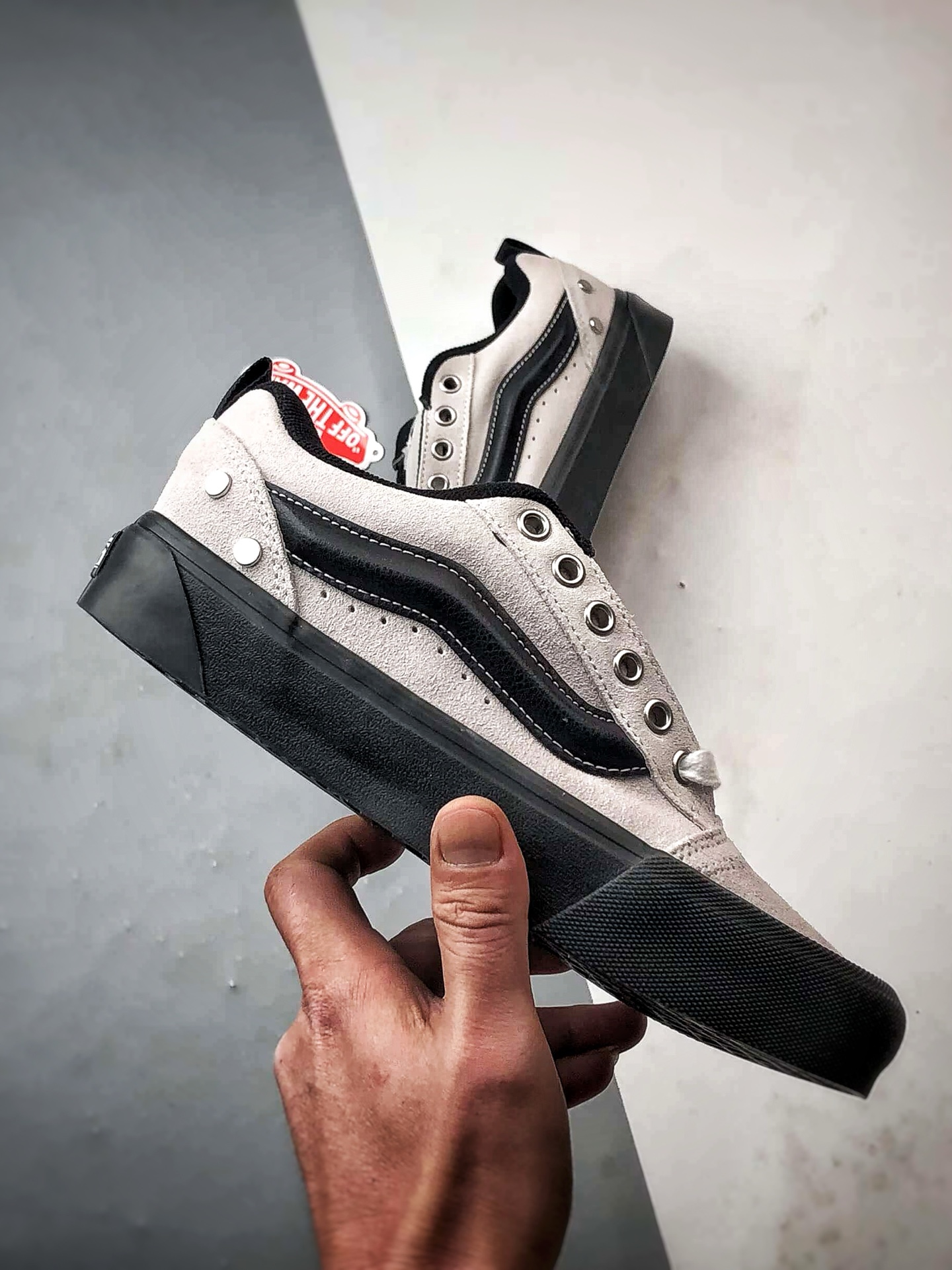 Vans Knu Skool 铆钉白黑配色,以铆钉元素点缀后跟,搭配麂皮材质与立体大Logo,复古街头感十足。