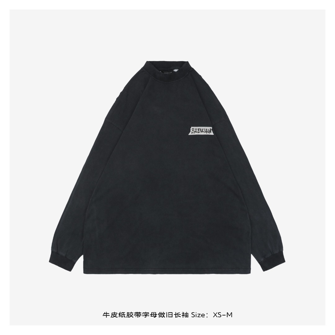 Balenciaga 做旧长袖,运用特殊浆料丝网印刷和“炒盐”物理磨损工艺,实现每件独一无二的仿纸印花与复古质感。