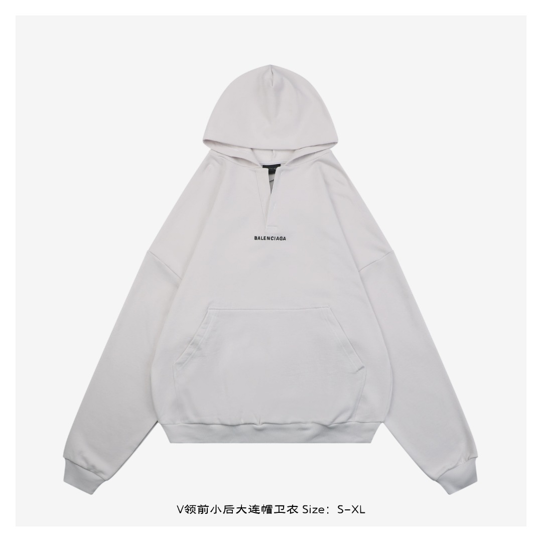 Balenciaga V领连帽卫衣,采用400克定制纯棉,经石磨与重酵素洗工艺打造复古褪色效果,版型为宽松前短后长设计。