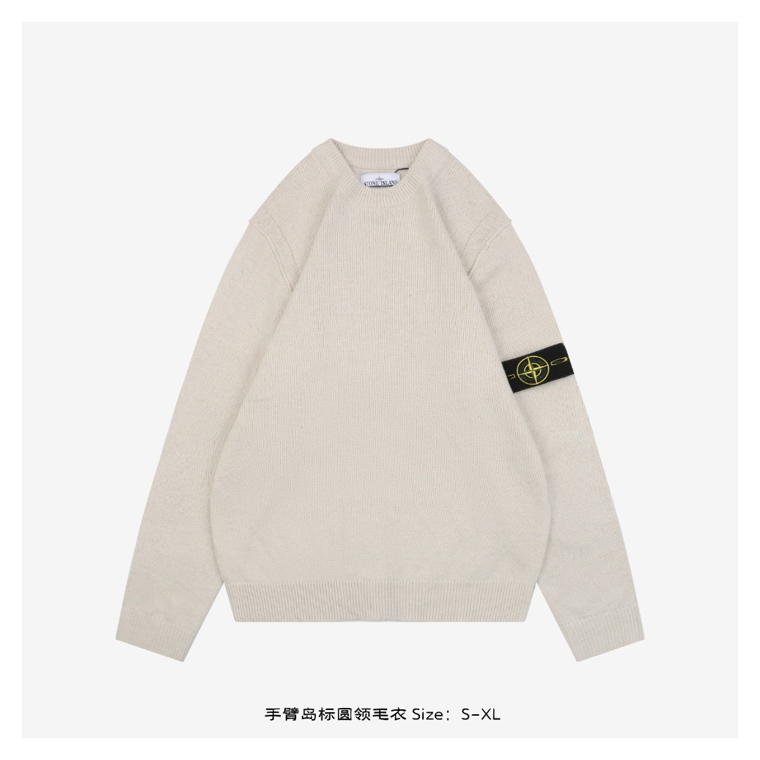 Stone Island 手臂岛标圆领毛衣,采用混纺材质与进口无缝电脑编织,结合宽松版型与精工洗水,打造柔软抗起球的复古慵懒造型。