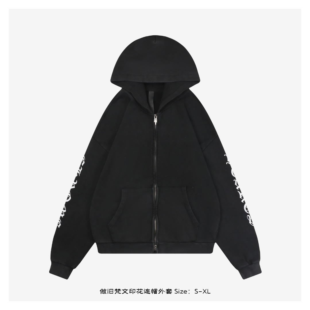 克罗心做旧梵文印花连帽外套,采用400克定制双股毛圈面料,经两遍水洗处理,舒适亲肤。进口数码直喷印花工艺,版型宽松百搭。