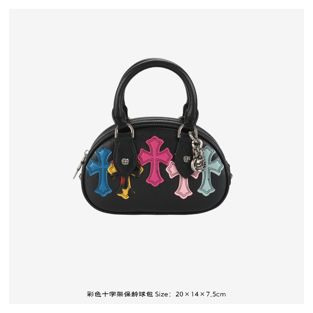 克罗心彩色十字架保龄球包,采用意大利进口摔纹头层牛皮与手工做旧泰银五金,色彩十字架装饰复古吸睛。