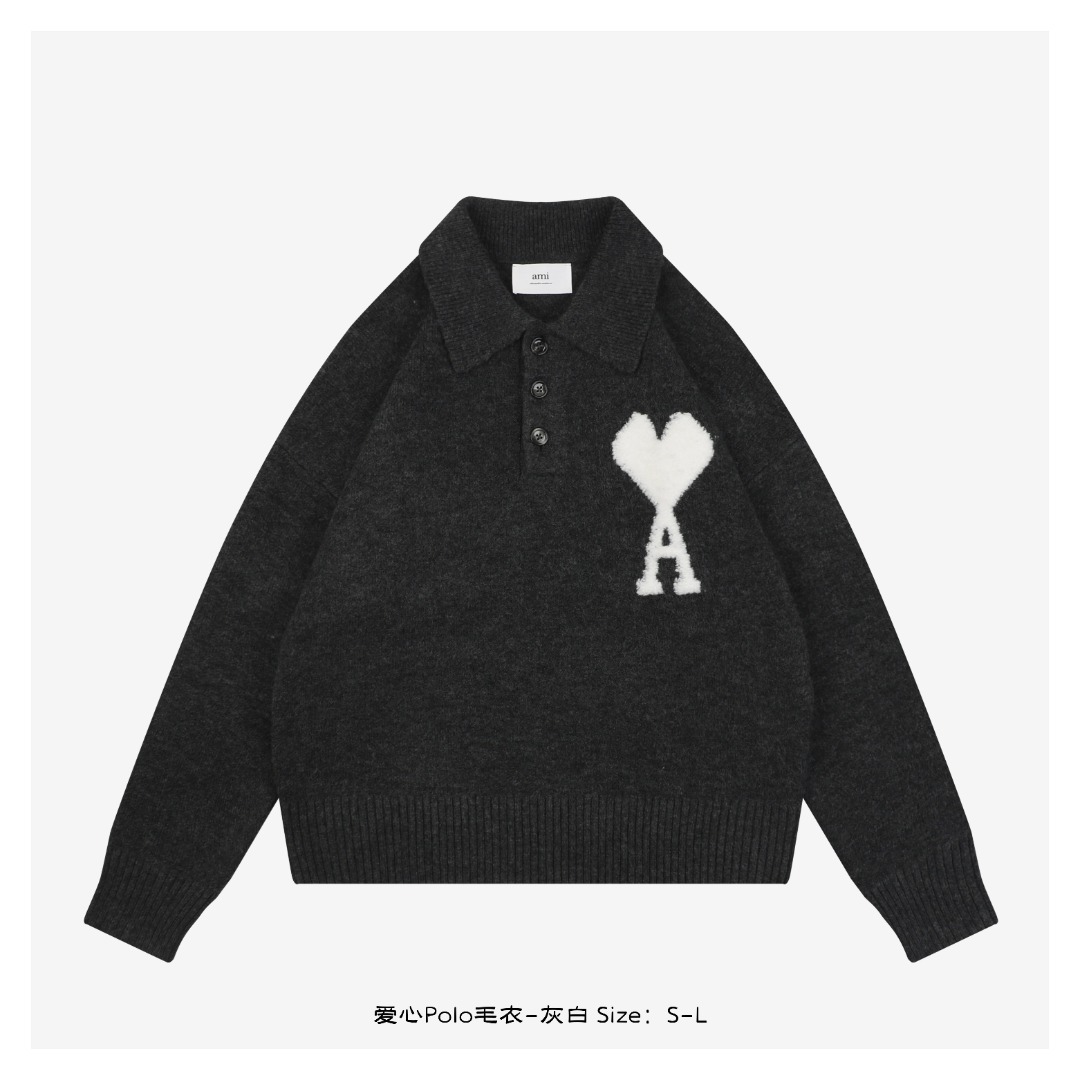 Ami 25Fw 爱心Polo毛衣,以4700元原版开发,采用定制羊绒混纺纱线,经由110分钟单件织造及复杂反套、嵌花工艺制成。