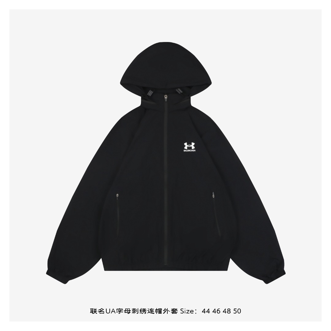 Balenciaga与Under Armour联名款连帽冲锋衣,融合UA专业防护科技与巴黎世家先锋设计,兼具户外性能与前卫时尚感。