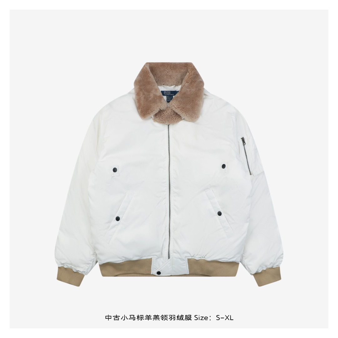 Ralph Lauren中古飞行夹克羽绒服,填充90白鸭绒(S码255g起),搭配进口澳洲羊羔绒毛领,还原90年代美式复古廓形。